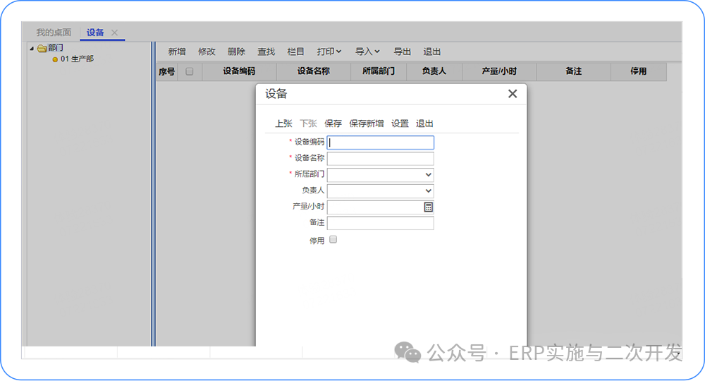 设备可设置工厂用于生产的设备信息,可设置设备每小时的产量,当设备属于某个工作中心时,会默认把产量带到工作中心中