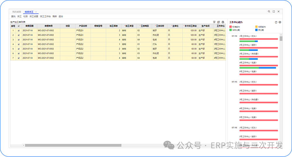 7 批量派工显示待派工任务+能力情况。派工时,可通过批量派工把多个需要派工的任务一起派工。派工时可以看到各工作中心提供的能力、已经派工的任务、可派工的能力,并且可以预测本次的派工数据占用的能力