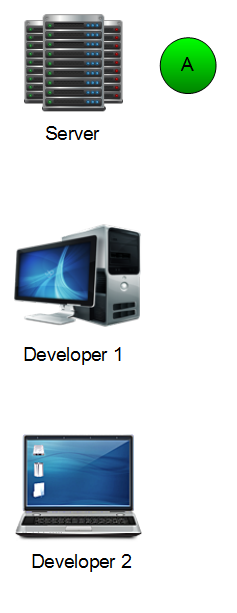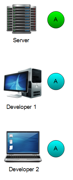 现在,每个开发者(开发者1和开发者2)都会拷贝版本“A”到他们本地电脑。再一次地,从服务器拷贝的过程会由于产品不同采用的技术会有所差别。