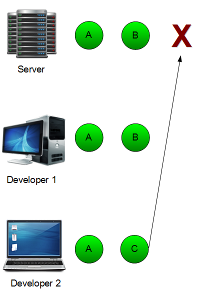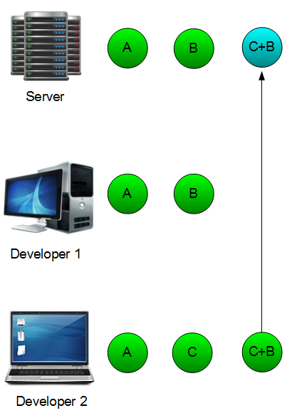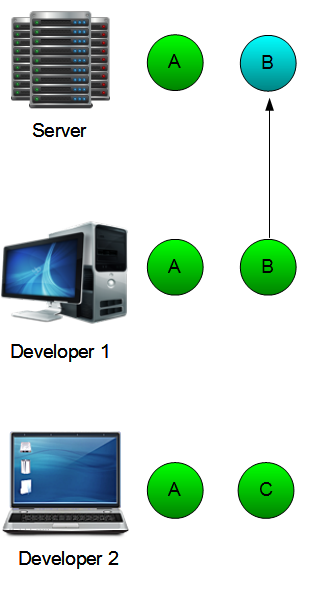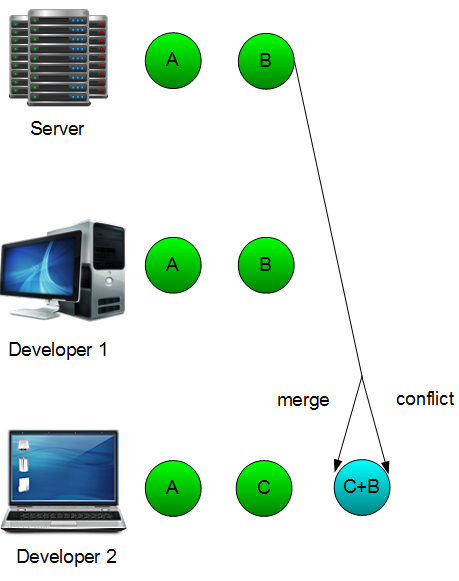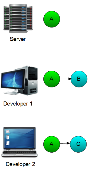 每个开发者会在他们的本地拷贝上进行开发。他们的本地拷贝基于版本“A”。然而,由于他们应该不会做同样的开发,因而他们的版本会有所差别。因此,会有2个以上的版本会同时被创建,比如版本“B”和版本“C”。