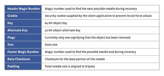haystack最前面的8K存储是被超级块占用。紧随超级块是针,每针组成的一个头部,数据和尾部: