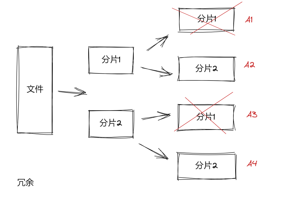 此时如果使用纠删码的做法就是,A1和A2分片数据还是保持不变,A3=分片1+分片2,A4 = 分片1+ 2*分片2,这样任意两份数据丢失,都可以恢复出分片1 和 分片2的数据了