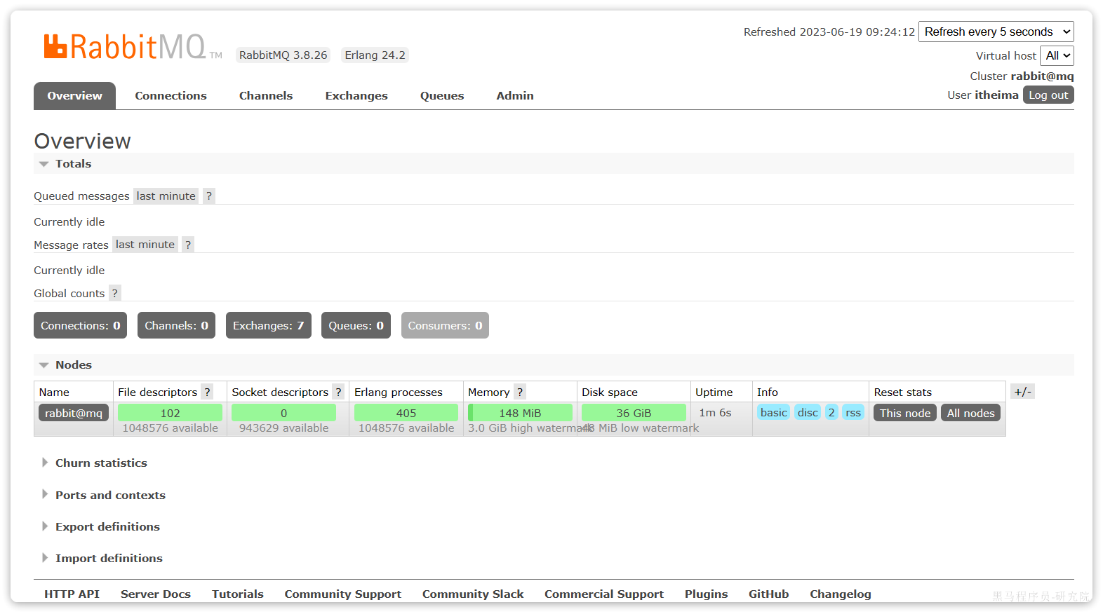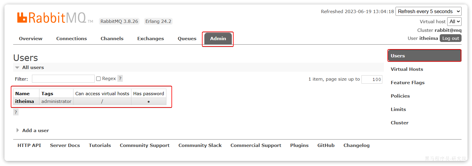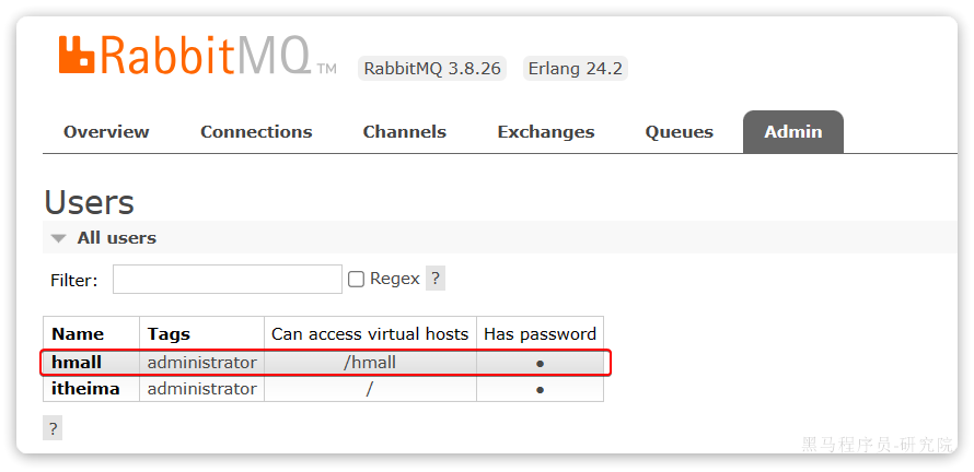 这里的用户都是RabbitMQ的管理或运维人员。目前只有安装RabbitMQ时添加的itheima
