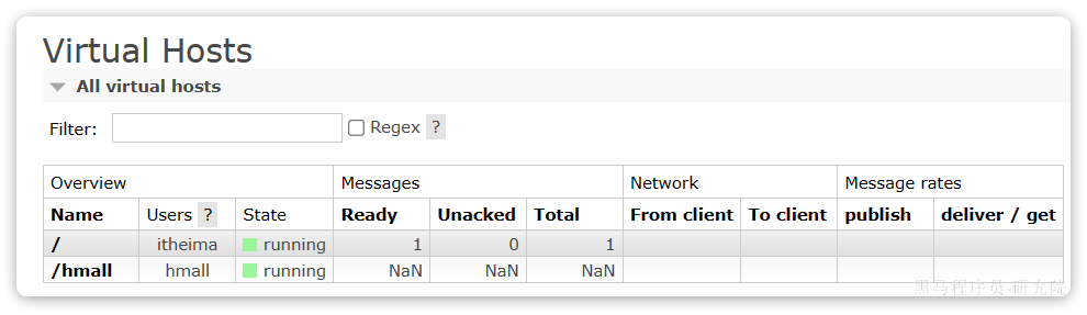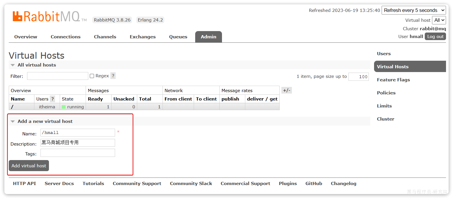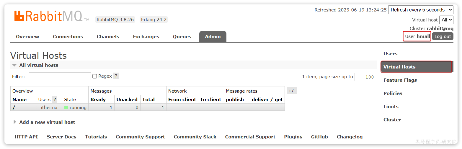 可以看到目前只有一个默认的virtual host