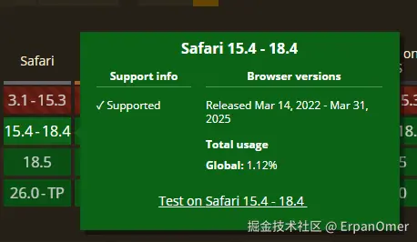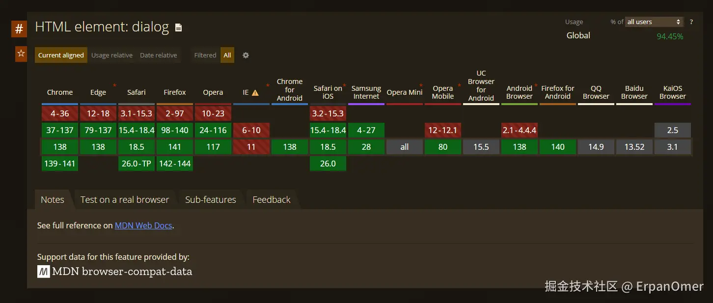到目前位置,主流浏览器几乎都支持原生dialog,但是值得注意的是 Safari, 它的支持度比起它浏览器稍晚,2022年后才开始支持,对于 Safari 浏览器 我更推荐大家使用等价的 polyfill 去解决。(推荐使用 Chrome 官方的 dialog-polyfill)