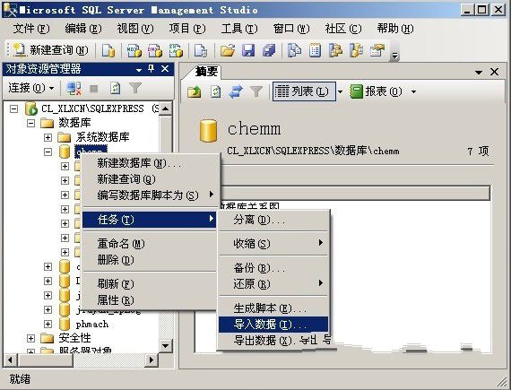 以前在2000里可以数据导入导出,当然在2005里也不例外,同样有这样的操作,只是在操作上和2000有点区别,下面通过图文的方法教你怎样导入导出数据。 操作步骤: 1、如图,在“对象资料管理器”里,右击你要导入导出数据的数据库,选择“任务”里的导入数据或导出数据,我这里以导入数据为例,导出数据和导入操作差不多。 2、选择后,会出现下图界面,选择数据源,数据源就表示你要从哪个数据库导入数据。数据库名就是你所使用的SQL服务器,如果是运程数据库,可直接写IP地址。这里我以本地为例。身份验证就是你用什么方式登录,如果是远程,一般用SQL Server身份验证,验证后,他会在数据库的列表里显示所有数据库,你要找到你要导入或导出的数据库,然后点“下一步”。