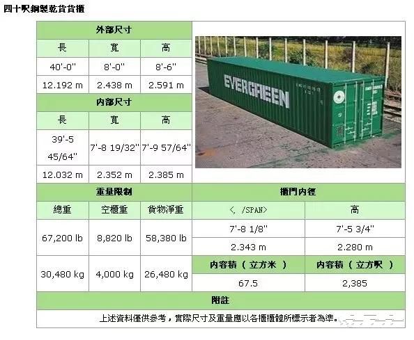 按照国际贸易货物的分类,一般分为散杂货和适箱货物。目前国际航运主干线上的适箱货物贸易基本上都已经采用集装箱运输。 集装箱的规格尺寸: 集装箱内部的最大长、宽、高尺寸。高度为箱底板面至箱顶板最下面的距离,宽度为两内侧衬板之间的距离,长度为箱门内侧板量至端壁内衬板之间的距离。它决定集装箱内容积和箱内货物的最大尺寸。 照片名称:20'GP(General Purpose Containe) 照片名称:40'GP(General Purpose Containe) 照片名称:40'HQ(High Cube Container 高柜) 照片名称:45'HQ(High Cube Container 高柜) 照片名称:20'OT(Open Top开顶) 照片名称:40'OT(Open Top开顶) 照片名称:20'FR(Flat Rack角柱式折迭平板) 照片名称:20'FR(Flat Rack角柱式折迭平板) 照片名称:40'FR(Flat Rack角柱式折迭平板) 照片名称:40'FR(Flat Rack板框式折迭平板) 照片名称:20'ISO TANK(罐式集装箱) 照片名称:40'超高挂衣柜 照片名称:20'Refrigerated(冷冻柜) 照片名称:40'High Refrigerated(冷冻柜)