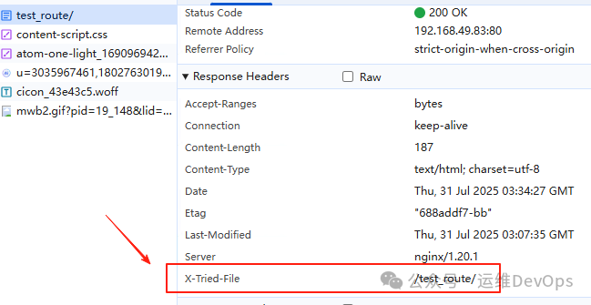 变量),查看响应头信息,可以看到X-Tried-File,如图:3、检查静态文件是否存在,不存在直接返回404,如图:请求gong.txt,既不存在此文件也不存在此目录,因此直接返回404,如图:4、访问页面,直接返回状态码,适合维护页面,如图:在abc目录下定义maintenace.html(名字要与nginx配置名字一致),然后通过192.168.49.83请求,如图:上面配置理解为:如果请求/hello,那么匹配/custom/hello,如果匹配不到就继续匹配/default/hello,如果都匹配不到就返回404(1)、在abc目录下新建custom目录并在内部创建gong.txt文件,新建default目录并在内部新建guan.txt,通过url请求,如图: