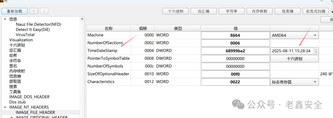 在标准编译的 PE 文件中,COFF Header 中有一个名为 TimeDateStamp 的字段。过去,大多数编译器和链接器在编译时会把当前时间写入这个字段,用来记录可执行文件的构建时间。早期,这个信息很有价值——不仅可以用来判断软件的版本和构建周期,还能帮助安全人员推测恶意软件的开发时间线,从而分析威胁行为者的活动历史。
