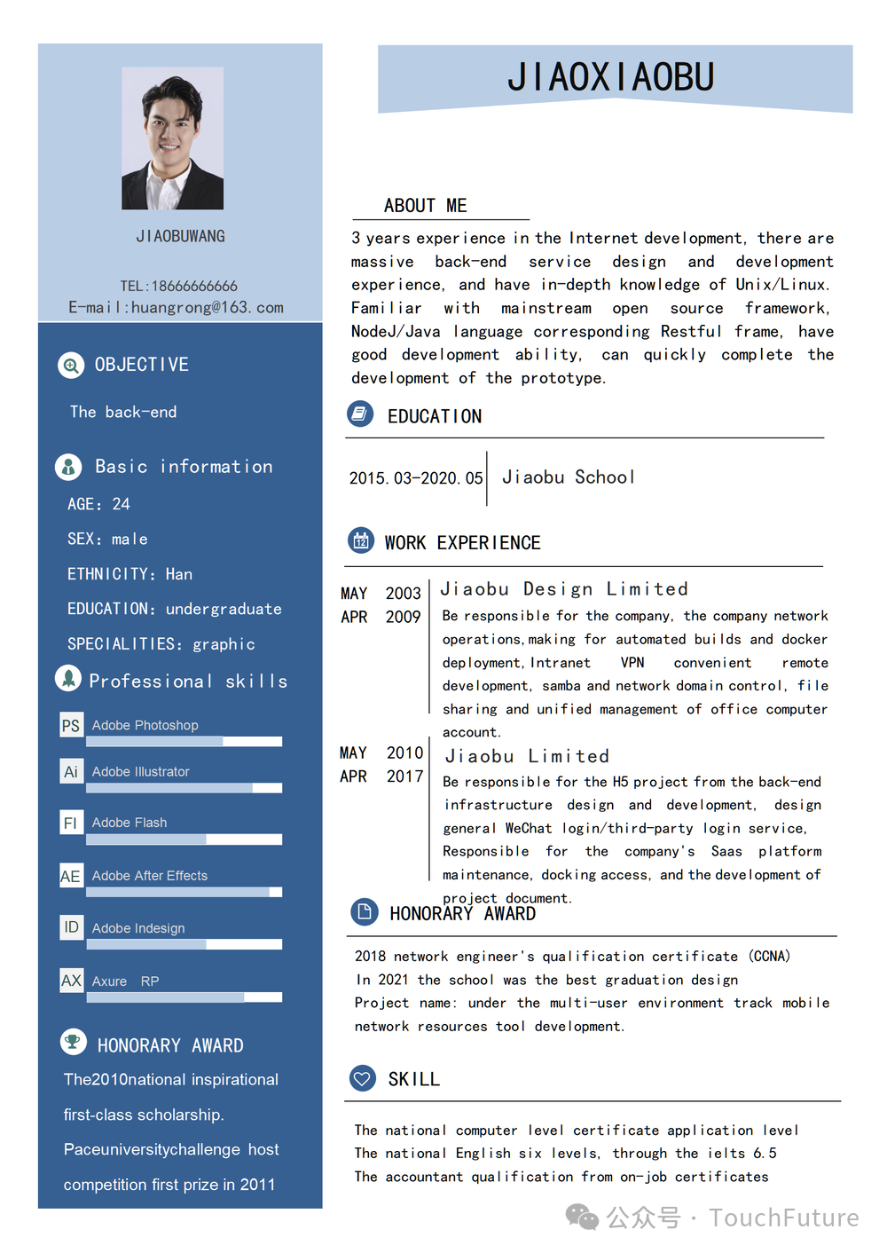 在下面的项目中我们使用下面的2份纯图片形式的求职简历作为输入,来测试OCR模型的识别和提取能力。