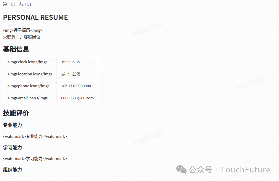 OCR Flux识别结果,文字保留相对完整,标题设置没有太大问题,唯一的不足之处是在简历中的“技能评价”处,标题设置不准确,有些是内容的部分被标记为标题,导致字体太大了。如果没有这一点问题的话,感觉和Nanonets-OCR-S不分上下。