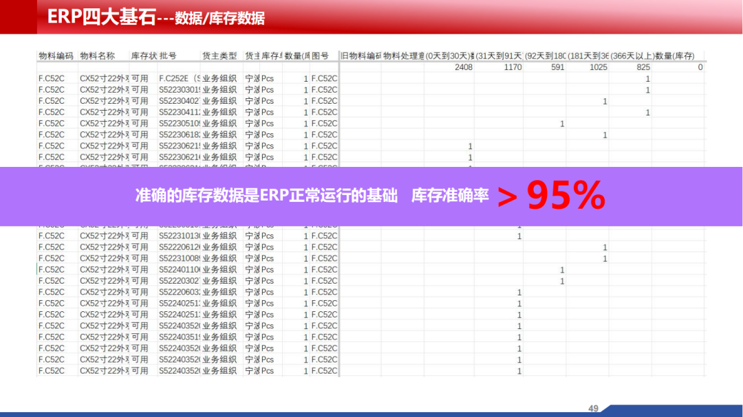 BOM数据、库存数据、订单数据准确率至少98%以上,系统单据时间与实际运行时间相符,通过ERP系统指标管理公司运营,供应商准时到货率、工单及时完工率、准时交货率至少达到90%以上,针对材料成品库存进行分析改进……