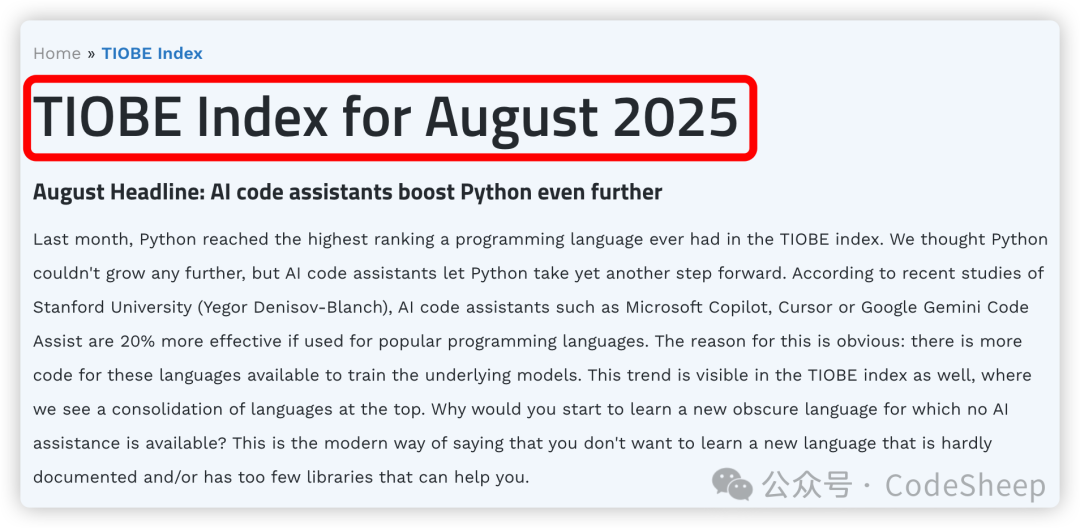 ![]() 其中 Python 可谓是一骑绝尘,与排名第二的 C++ 甚至拉开了近 17% 的差距,呈现了断崖式领先的格局。 不愧是 AI 领域当仁不让的“宠儿”,这势头其他编程语言简直是望尘莫及! 另外还值得一提的就是 C 语言。 最近这几个月 C 语言的 TIOBE Index Ratings 比率一直在回升,这说明其生命力还是非常繁荣的,这对于一个已经诞生 50 多年的编程语言来说,着实不易。 C 语言于上个世纪 70 年代初诞生于贝尔实验室,由丹尼斯·里奇(Dennis MacAlistair Ritchie)以肯·汤普森(Kenneth Lane Thompson)所设计的 B 语言为基础改进发展而来的。 ![]() 就像之前 TIOBE 社区上所描述的,这可能主要和当下物联网(IoT)技术的发展繁荣,以及和当今发布的大量小型智能设备有关。毕竟 C 语言运行于这些对性能有着苛刻要求的小型设备时,性能依然是最出色的。 说到底,编程语言本身并没有所谓的优劣之分,只有合适的应用场景与项目需求。 按照官方的说法,TIOBE 榜单编程语言指数的计算和主流搜索引擎上不同编程语言的搜索命中数是有关的,所以某一程度上来说,可以反映出某个编程语言的热门程度(流行程度、受关注程度)。 而通过观察一个时间跨度范围内的 TIOBE 指数变化,则可以一定程度上看出某个编程语言的发展趋势,这对于学习者来说,可以作为一个参考。 Java:我啥场面没见过![]() 曾经的 Java 可谓是互联网时代不可或缺的存在。早几年的 Java 曲线一直处于高位游走,彼时的 Java 正是构成当下互联网生态繁荣的重要编程语言,无数的 Web 后端、互联网服务,甚至是移动端开发等等都是 Java 的擅长领域。 而如今随着 AI 领域的发展和繁荣,曾经的扛把子如今似乎也感受到了前所未有的压力。 C语言:我厉兵秣马![]() 流水的语言,铁打的 C。 C 语言总是一个经久不衰的经典编程语言,同时也是为数不多总能闯进榜单前三的经典编程语言。 自诞生之日起,C 语言就凭借其灵活性、细粒度和高性能等特性获得了无可替代的位置,就像上文说的,随着如今的万物互联的物联网(IoT)领域的兴起,C 语言地位依然很稳。 C++:我稳中求进![]() C++ 的确是一门强大的语言,但语言本身的包袱也的确是不小,而且最近这几年的指数趋势稳中求进,加油吧老大哥。 Python:我逆流而上![]() 当别的编程语言都在震荡甚至下跌之时,Python 这几年却强势上扬,这主要和当下的数据科学、机器学习、人工智能等科学领域的繁荣有着很大的关系。 PHP:我现在有点慌![]() PHP:我不管,我才是世界上最好的编程语言,不接受反驳 好了,那以上就是今天的内容分享了,感谢大家的阅读。 阅读原文:点击这里 该文章在 2025/9/1 15:11:14 编辑过 |