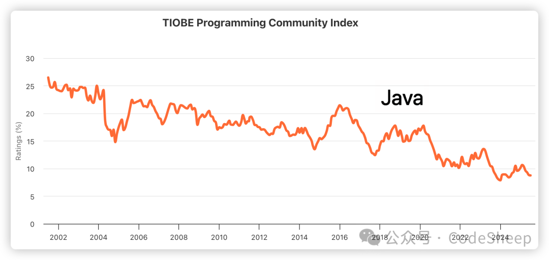 TIOBE 编程社区相信大家都听过,这是一个查看各种编程语言流行程度和趋势的社区,每个月都有榜单更新,每年也会有年度榜单和总结出炉。 昨晚在家整理浏览器收藏夹时,才想起了 TIOBE 社区,于是打开看了一眼最近的 TIOBE 编程语言社区指数。 ![]() 没想到,Java 居然已经跌出前三了,并且和第一名 Python 的差距也进一步拉开到了近 18%。 ![]() 回想起几年前,Java 曾是何等地风光。 各种基于 Java 技术栈所打造的 Web 后端、互联网服务成为了移动互联网时代的中坚力量,同时以 Java 开发为主的后端岗位也是无数求职者们竞相选择的目标。 然而这才过去几年,如今的 Java 似乎也没有了当年那种无与争锋的强劲势头,由此可见 AI 领域的持续进化和繁荣对它的冲击到底有多大。 用数据说话最有说服力。 拉了一下最近这二十多年来 Java 的 TIOBE 社区指数变化趋势看了看,情况似乎不容客观。 可以明显看到的是一个:呈震荡式下降的趋势。 ![]() 现如今,Java 日常跌出前三已经成为了常态,并且和常居榜首的 Python 的差距也是越拉越大了。 在目前最新发布的 TIOBE Index 榜单中排名前十的编程语言分别是: