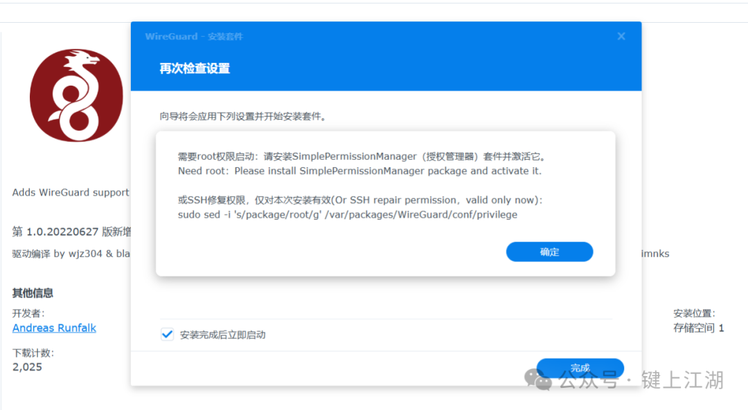 2、选择wireguard安装,安装完成会提示需要root权限,可以按提示任选其一操作,我这里演示安装授权管理器(SimplePermissionManager)套件,这个套件是用于授权哪些需要root权限的应用。