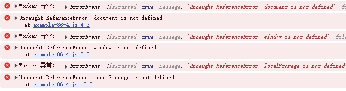 在子线程中运行的代码,无法直接操作 DOM,无法访问 window/document 对象,也无法使用 localStorage 等,如果使用这些 API,代码将会报错: