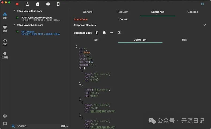 - 流量拦截与实时查看: 支持拦截 HTTP 和 HTTPS 的网络请求,包括 URL、Header、Body 等重要信息一览无余。