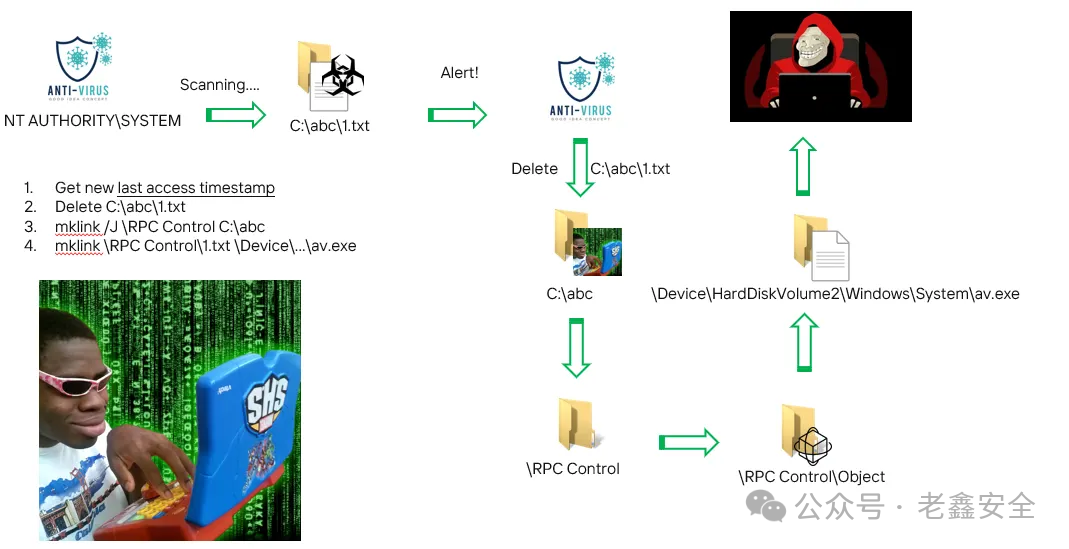 符号链接:Windows系统中的隐形攻击通道符号链接在 Windows 系统中的存在,几乎与系统自身的历史一样悠久。而基于符号链接的漏洞利用技术,也早已不是新鲜事物——早在 1999 年,安全研究员大佬 James Forshaw 就在其分享中首次系统性地揭示了这一攻击思路(参见:https://www.slideshare.net/slideshow/abusing-symlinks-on-windows/47554612#34)。 自此之后,该技术被众多研究人员深入挖掘、不断完善,直至今天,依然是提权漏洞中的“常青树”。几乎每年都有大量相关 CVE 被披露,可以说,它始终在权限提升的战场上反复横跳,从未退场。 虽然这项技术早已被安全界所知,也有不少前辈研究过,不过到今天都很少见到有安全课程或文章真正系统地讲解它们。 说实话,我对主流热门的安全课程竟然忽视了符号链接滥用这一东西感到一些惊讶。 正因如此,决定写下这篇文章。不过今天要聊的,可不是提权那点事儿。 我们要解锁一个更带感的实战场景——如何用符号链接玩转“白加黑”攻击,甚至直接致盲 EDR。 其实早在之前,我就发过相关内容: 难绷,一种重命名+符号链接禁用EDR(Crowdstrike)的方法 具体参考Avast Free Antivirus 的任意文件删除到权限提升:https://www.zerodayinitiative.com/blog/2024/7/29/breaking-barriers-and-assumptions-techniques-for-privilege-escalation-on-windows-part-1 为了便于理解,这里大概解释下: 我们来看看下面这段伪代码Demo: