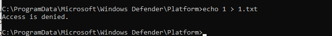 Windows Defender 始终阻止将文件写入其运行文件夹,“ Platform ”文件夹也不例外。 但是,如果是创建一个新文件夹而不是写入文件,会怎么样呢? 毋庸置疑,完全可以在“ Platform ”文件夹中创建任意名称的文件夹。 So,结合之前Windows Defender 如何过渡到新版本的信息,如果在“Platform”中创建一个以最高版本号命名的文件夹,Defender 会将这个文件夹用作其执行文件夹 之后,在“Platform”文件夹中创建一个指向新路径 (C:\temp\av) 的目录符号链接(SYMLINK )。确保 SYMLINK 名称对应于“ Platform ”中现有文件夹的最高版本号。例如,如果当前版本为“4.18.25070.5-0”,那么创建一个名为“5.18.25070.5-0”的 SYMLINK,以保证此 SYMLINK 具有最高的版本号。