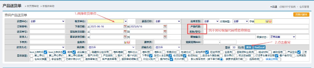 ![]() 1.进入ERP系统之后,点击“BOE定制”,点开“正常加工”,找到“新增成品送货单”。 2.进入界面之后,按图操作:点击选择销售客户,然后再点击选择送货类型。