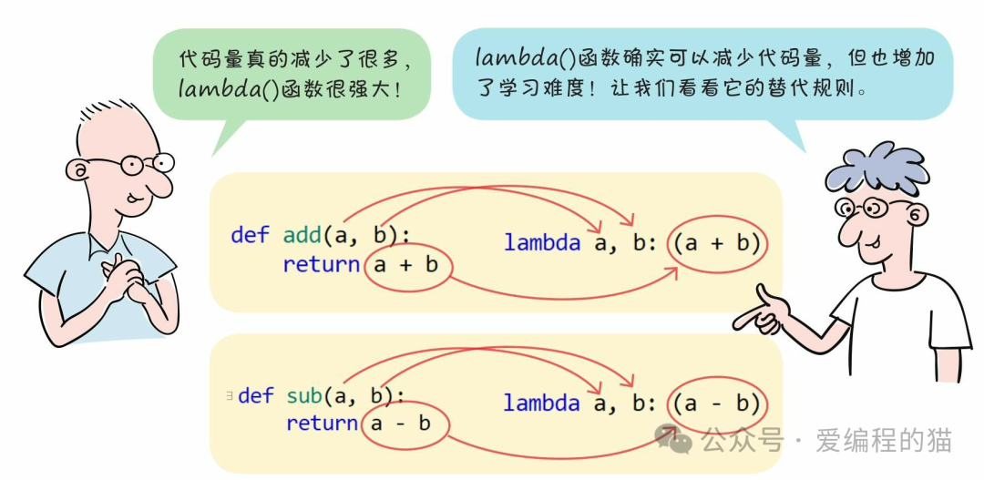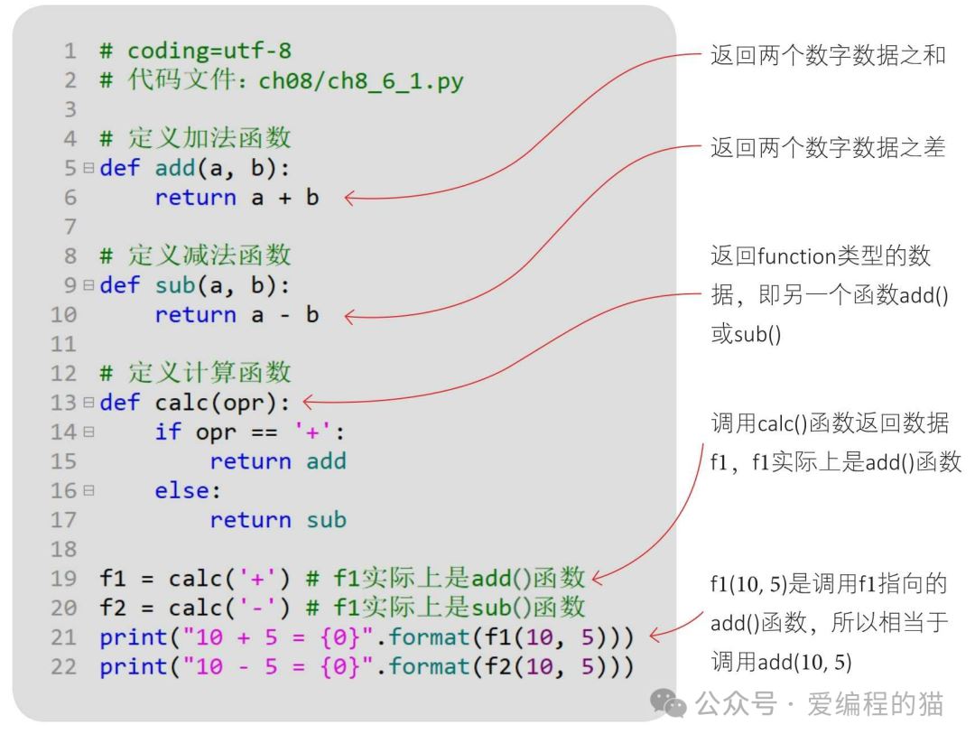 lambda()函数与有名称的函数一样,都是函数类型,所以8.6.1节 的add()和sub()函数可以被lambda()函数替代。修改8.6.1节的代 码示例如下: