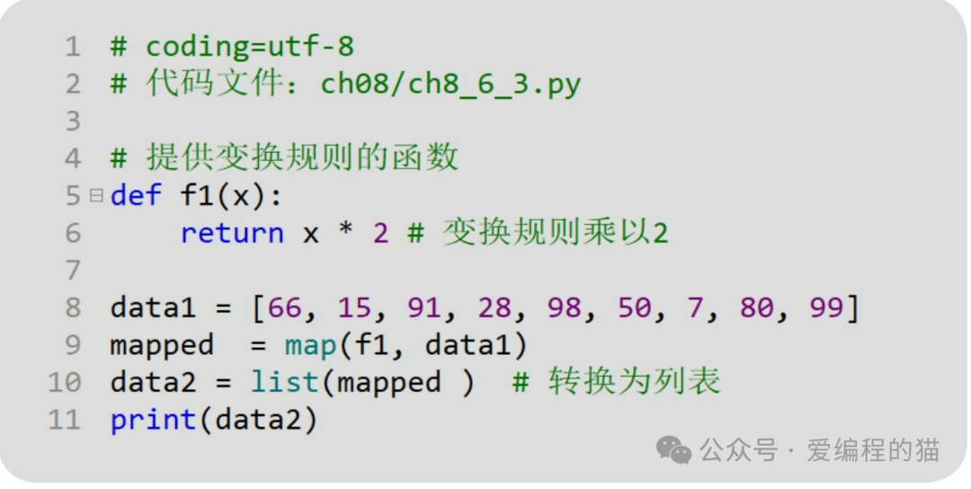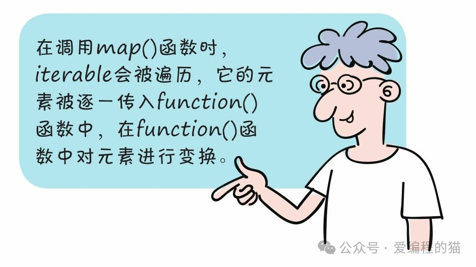 参数function是一个提供变换规则的函数,返回变换之后的元素。 参数iterable是容器类型的数据。