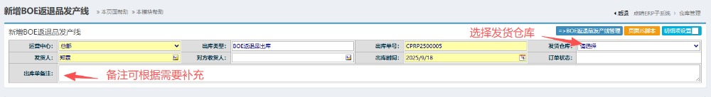 2.进入界面后,按图操作:选择发货仓库备注可根据需要补充。