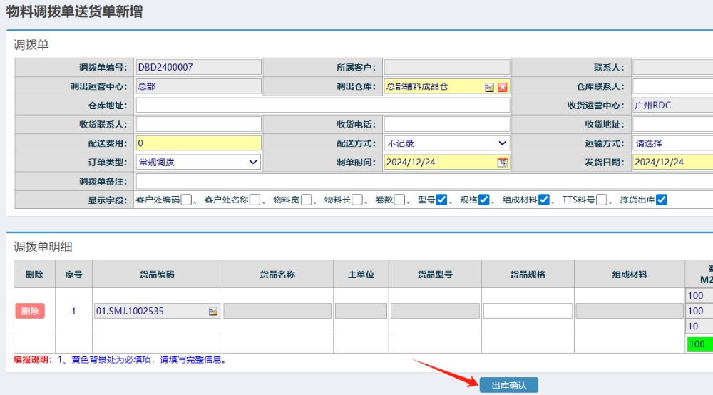 点晴模切ERP-调拨出库单-发货操作