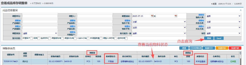 ![]() ![]() 本教程是针对BOE成品返退流程中返退来源为“自主重工”,需要进行物料状态调整。 注:如果是正常BOE返退品的话可直接到最下方的“BOE返退品流程”! 1.进入ERP系统之后,在左侧的功能菜单里找到“仓库管理”,点开“物料在库管理”,点击“新增物料状态调整单”。 2.进入界面后,按图操作:物料大类选择成品,点击查询。然后点击对应物料信息,点击增加调整单。 在调整单界面内,按图操作:质量状态调整为BOE返退品,调整库存数量以及选择对应的仓库。最后点击提交。