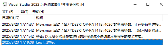 连接成功后,测试机(或虚拟机)msvsmon.exe 会显示对应日志。