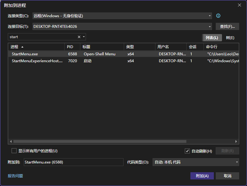 • 远程服务器名称:目标机器名称。msvsmon.exe 日志显示的名称,如 DESKTOP-RNT4TEI;这里也可以 IP+端口形式连接