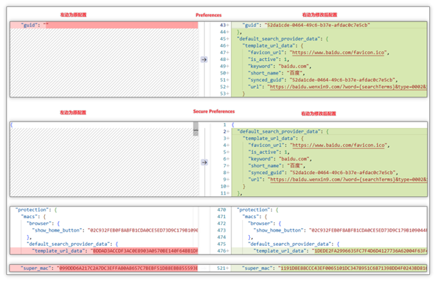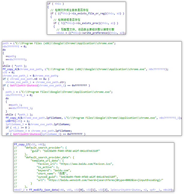 修改默认搜索引擎:通过写入 Preferences 与 Secure Preferences 配置文件的方式将 template_url_data 中 url 设置为 baidu.wenxin9.com/?{searchTerms}&type=0002&ie={inputEncoding}。之后用户再次搜索内容时先跳转到 baidu.wenxin9.com/?搜索内容&type=0002&ie=UTF-8,最终跳转至 www.baidu.com/s?tn=75144485_10_dg这类带有来源标识的链接并从中获利。