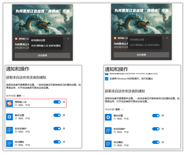 弹窗设置变灰或消失:但用户反馈该方法只能满足初期的诉求,一段时间后发现弹窗中“…”后两个按钮都变成灰色,导致进入系统通知设置,也无法关闭搜狗输入法相关选项。