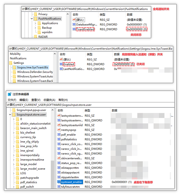 href="">2. 局部搜狗输入法通知开关:系统自带设置中局部通知开关,将开关数据存储于注册表 HKEY_CURRENT_USER\SOFTWARE\Microsoft\Windows\CurrentVersion\Notifications\Settings\Sogou.Ime.SysToast.Biz 项 Enabled 键值中。