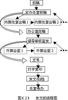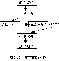 (3) 收文管理 收文管理主要对外来公文进行登记和处理。主要用于登记像税务局发来的文件、公安部门发来的文件、总公司发来的文件行业主管部门来文的处理过程、协作单位发来的文件处理过程、兄弟单位发来的文件处理过程、及其它外来的公文文件的处理过程。 主要的处理过程有:收文登记、主任拟办、领导批示、处室承办、传阅、送交归档等功能。在领导批办界面可以将文件送往更高一级的领导进行审批,到底由哪些处室承办,送交给哪些处室由最高领导决定。管理人员可以通过“收文查询操作”对收文处理全过程进行跟踪与监督。 对办理完毕的收文系统还提供全文检索、条件检索、统计等功能。 图(3)是整个收文的流程图,用户可以根据需要选择其中的某些步骤来完成收文的管理。