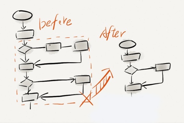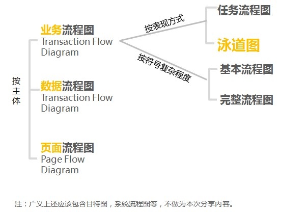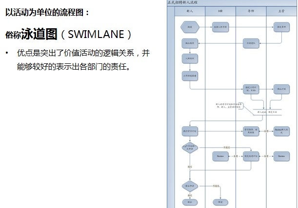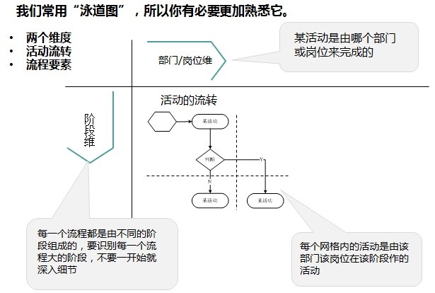 当然,除了业务流程,系统流程,页面流程,还有数据流程被人关注。 我们平时工作中,还会经常听人谈到泳道图啊,任务流程图啊等等概念,究竟是神马关系呢? ![]() 图5:流程图的分类 本文着重于上述流程中的“业务流程图”——并会分享如何绘制泳道图——也即是PD们最多使用,技术们最多参考,UED们最多看到的流程图。 本来在第四部分会对泳道图的图示以及绘制方法、原则做更详细的说明,但是看目前的篇幅情况,预计会放到下篇,所以先在这里简单说明下吧。 在工作中,我们经常能够看到两种业务流程图,从表现形式来看,一种很好区分,俗称为“泳道图”的它,在样子上也确实像个泳道,可以有横向的泳道,也会有纵向的泳道。泳道图在某些文档里会被称为“以活动为单位的流程图”,浮在泳道中的都是一个个活动。 ![]() 另外一种类型是以部门和岗位为单位的流程图,下图中的圆形就代表一个个部门或岗位。矩形代表活动。这种流程图关注事情如何完成的逻辑,但是在体现各个部门的责任上比较弱。如果是某个岗位的人来看,很难像泳道图那样一眼就能看到自己部门的职责和任务。所以现在用得比较少。 ![]() 再回过头来说泳道图,泳道图有几个关键点:两大维度,活动流转,流程要素。我们会在以后详解。 ![]() 第三部分:为什么需要业务流程图? 流程图可以提供一种简单扼要的“缩略俯瞰图”,帮助观众快速了解业务如何运转。它包含了几个关键词:谁,什么时候,在什么条件下,做了什么事情,输入什么,输出什么,输出给谁…… 与系统流程不同,业务流程更关注于业务本身如何运作,讲的是业务故事,包含的是业务规则。而系统流程则是满足业务流程,实现部分流程或全部流程的信息化和系统化。 所以业务流程是所有环节的前置条件——软件需求分析,信息系统建设也会先进行业务流程的梳理。 下面表现了业务流程图是如何在三个主要场景中发挥作用的: 1. 员工培训 ![]() 图6:流程图的应用场景之一:培训 在此场景中:流程图能够提供一种快速了解业务如何运作的视图,通过业务流程图,新员工能够快速明白业务的最终目标是什么,中有哪些角色在参与以及他们的职责,以及彼此之间的联接。 除了培训新员工,在员工轮岗、调职场景中,员工也需要业务流程图参考,明白新的工作内容如何开展,以及自己所处的位置,自己的上游是谁,下游是谁,自己需要交付的工作内容是什么。 2:流程优化与重组 ![]() 图7:流程图的应用场景之二:流程优化 业务流程重组(Business Process Reengineering)的存在可以明确反驳:存在即合理。事实上,存在的业务流程并未是合理的,有可能是参与的多个角色习惯了某种做法,有可能是变革尚未影响到末端的操作,也有可能缺乏对于运行中的业务流程问题的洞察以及强有力的变革推动——因为要推动业务流程变革,不是某个部门的事情,而是需要流程中各个部门的通力配合。 更多时候,业务流程优化是自上而下的,但是老板们未必对实际运作的业务流程那么心知肚明,业务流程图能够很好去表现这个“运作模型”。通过看业务流程图,找关键节点的人访问,能够直接切入:为什么要这么做,为什么不这么做?从而探索出更深层次的问题,而不是问:你们现在怎么做? 通过调研,分析业务流程图,引入更多角色,能够分析出目前业务流程的问题:缺失,重复,风险,效率等等。从而制定相应的优化方案。 3:信息化的基础 ![]() 图8:流程图的应用场景之三:信息化基础 正如上文所述的餐馆梦想的案例,信息系统的一项任务就是解放员工的手脚,取代一些重复的人力劳动工作。系统上了之后,不是说业务流程不需要而是经过了一些调整,其中某个参与者变成了系统,或手持设备,或打印机而已。 那么在做系统的功能设计和系统流程设计时,是不是必须先要了解目前业务是如何运作的呢?从而更好分析分析,更好说明系统在什么环节取代了什么类型的人肉工作? 所以我们看到的PRD往往也会先以业务流程图开始说明,而叙述一个系统建设的好处时,也可以用以前的业务流程与系统上了之后的业务流程进行对比。根据分析,将愿景中的新的业务流程图背后需要系统的功能点撰写清楚。 第四部分:如何绘制业务流程图? 首先绘制业务流程图本身有没有流程?一定是有的。在软件工程学里听说一句话叫:万物皆对象。那么在流程学里,万事皆流程。吃饭难道没流程吗?就吃饭的动作而言,就有流程:拿筷子——夹菜——入口——咀嚼——吞咽。 有不少同学在这一部份很快想会问一个问题:Heidi,请介绍画流程图的工具吧? 我个人是工具派,从不否认人工欲善其事,必先利其器的道理。好的工具本身就是一名好的老师,除了技能,也能够教会我们一些理论与理念,这些理念也是“器”中很重要的一部分。其次才是具体的工具应用技能。所以我并不建议直接跳转到工具应用。对于初学者而言,笔与纸永远是最好的入门工具,因为你无需和任何一个陌生的软件较劲。 那么,绘制业务流程图有没有可遵循的流程呢?我建议可以从下面4步着手。 1. 调研