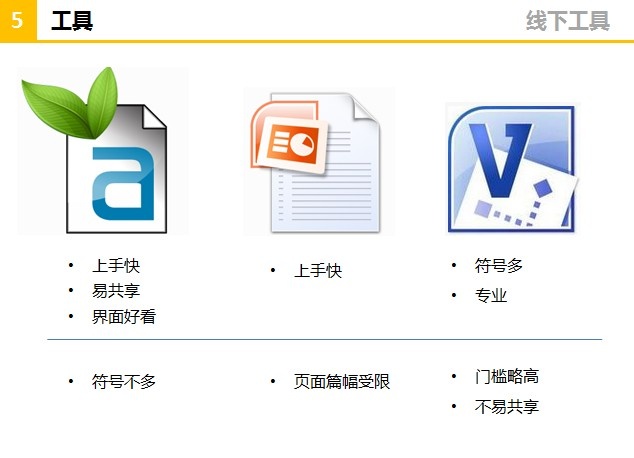 3. 评审与确认——能否真正让业务流程图反映现实中的业务? 4. 归档维护——流程不断变更,业务流程图如何快速响应? 这些将会在下篇《业务流程图的绘制流程分享(二)》详解。 第五部分:绘制工具? 如果不搞工具研讨会的话,这部分比较简单. Windows: 线下工具大家常用的就是下面三个: 小的流程图用用PPT就够了,完了就导出图片或截图。交互设计师们因为常用axure绘制线框图,所以也不必为了流程图去学习新的工具,完全可以用axure的flow控件完成简单的业务流程图的制作。而PD们则常用微软的visio。 ![]() 此外,特别推荐一个软件:SmartDraw。 我最近的流程图都是用SmartDraw绘制的,你可以下载一个免费版本体验下。这个工具不仅仅是为了流程图而设计的,几乎上包罗万象:线框图,流程图,E-R图,UML ,韦恩图,甚至甘特图,脑图……没有像很多人推荐就是因为他太庞大了,尤其是里面的模版。大家体验下: ![]() Mac电脑: 自然要推荐omniGraffle. 绘制出来的任何图表不知为何总会觉得很美…… 当然,这个软件是可以去www.macx.cn下载免费版的…… 但是不管windows还是mac,除了线下的工具,还有更多线上的选择: 不过貌似我们对线上工具普遍来说都不太放心,是对服务器,网速,还有对GFW不放心吧。 ![]() 这个是界面做得最好看的一个工具。我用它来绘制过概念图(Concept map)。如下图即是用以上的工具画的。 ![]() 2. http://creately.com/ ![]() 3. www.lucidchart.com ![]() 转载请注明来处,关注我请点击:http://weibo.com/heidixie 该文章在 2012/11/19 9:53:59 编辑过 |