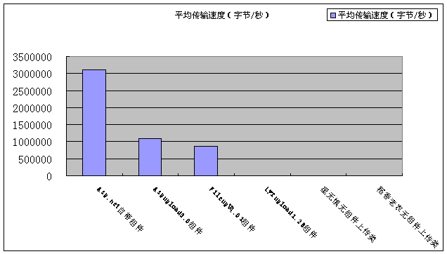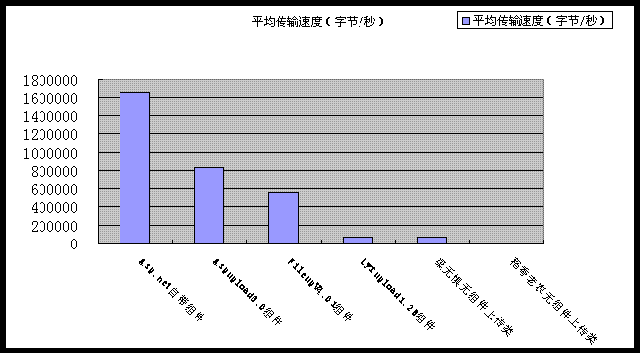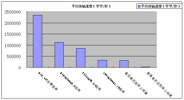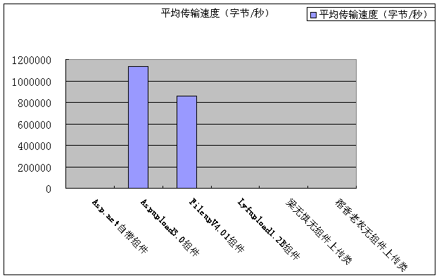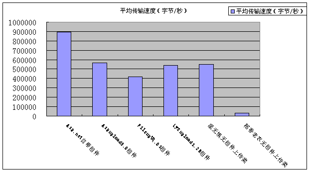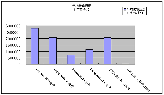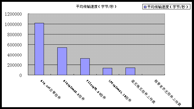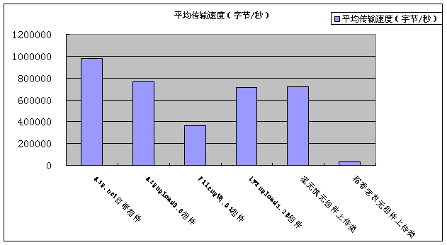 另外,这个测试是在局域网的环境下进行的,取得的数据传输率较高,但由于测试要点并不是进行定量的测试,而仅仅是比较各个上传组件之间的性能,传输率高低并不重要,重要的是它们之间的性能对比以及对服务器CPU的占用程度。如果哪位朋友有不同意见的话,欢迎一起探讨。