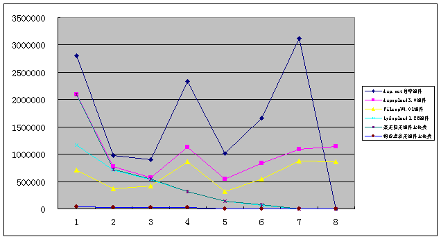 本组测试又出现了奇怪的现象,前三个上传组件的上传速度在文件大小扩大一倍的基础上反而增加了,增幅最大的FileupV4.01更达到惊人的70%提升;后两个组件上传速度随着文件的增大等比例的下降。从速度上看,仍然是asp.net组件的速度领先,其次的aspupload3组件仅仅是它的50%,更不用说最低速度的后两个组件了,只及asp.net组件的4%。