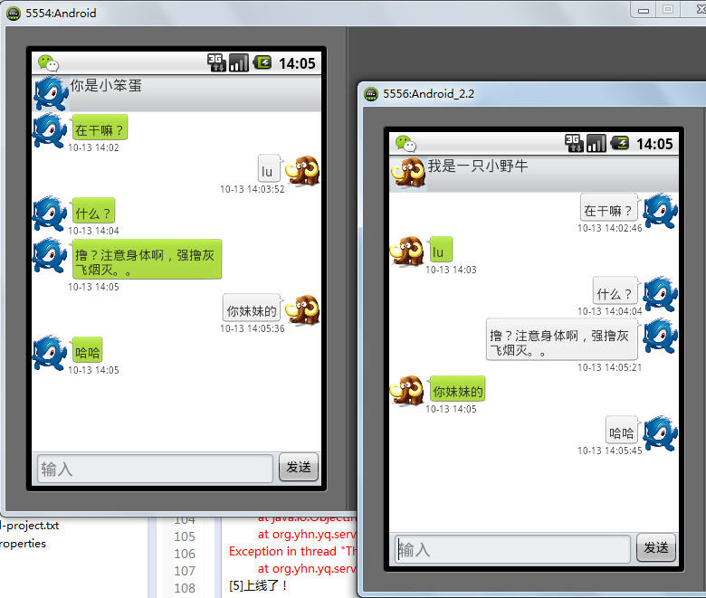 实现方式还是listview自定义adapter,只不过用了两个布局文件,左边的一种布局,右边的一种布局,在消息实体类中添加一个变量,用来判断是发出的消息还是收到的消息,从而在adapter的getView()中,决定采用哪种布局。