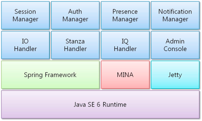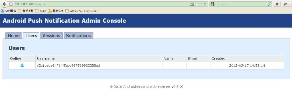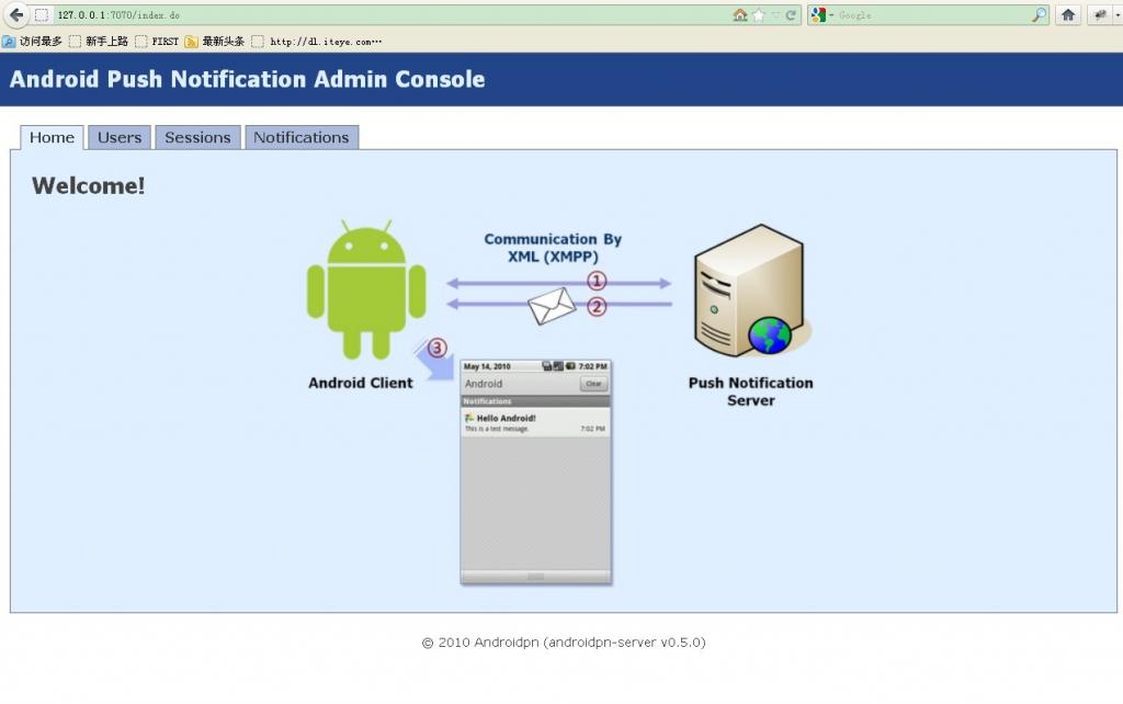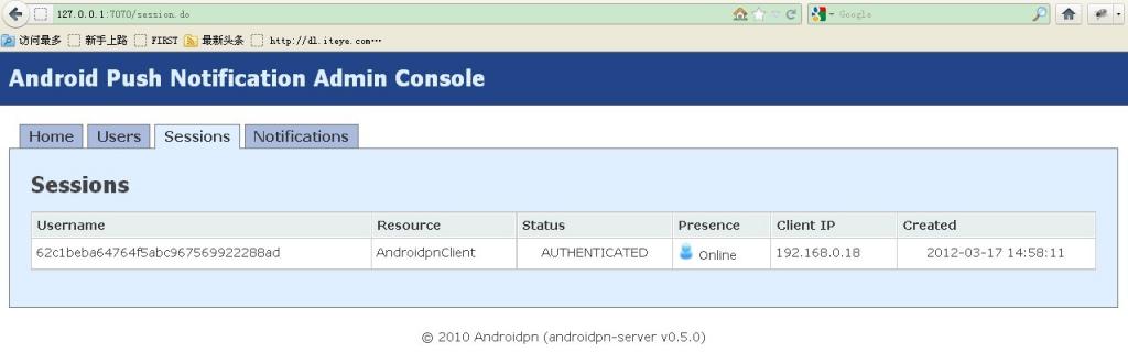 androidpn客户端需要用到一个基于java的开源XMPP协议包asmack,这个包同样也是基于openfire下的另外一个开源项目smack, 不过我们不需要自己编译,可以直接把androidpn客户端里面的asmack.jar拿过来用。客户端利用asmack中提供的 XMPPConnection类与服务器建立持久连接,并通过该连接进行用户注册和登录认证,同样也是通过这条连接,接收服务器发送的通知。 androidpn 服务器端也是java语言实现的,基于openfire开源工程,它的Web部分采用的是spring框架。Androidpn服务器包含两个部分,一个 是侦听在5222端口上的XMPP服务,负责与客户端的XMPPConnection类进行通信,作用是用户注册和身份认证,并发送推送通知消息。另外一 部分是Web服务器,采用一个轻量级的HTTP服务器,负责接收用户的Web请求。服务器架构如下: 最上层包含四个组成 部分,分别是SessionManager,Auth Manager,PresenceManager以及Notification Manager。SessionManager负责管理客户端与服务器之间的会话,Auth Manager负责客户端用户认证管理,Presence Manager负责管理客户端用户的登录状态,NotificationManager负责实现服务器向客户端推送消息功能。 服务器端界面如下,分别对应了上述的几个功能模块:
