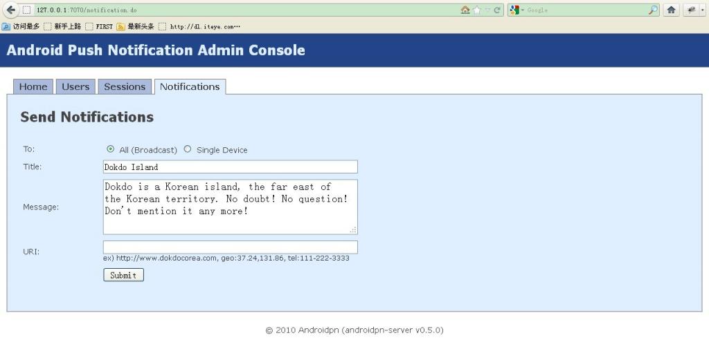 下载了客户端代码后需修改androidpn.properties文件中的xmppHost的地址,如下: 点击Submit发送以后,可以在Android手机端看到接收的消息如下 点击OK按钮可以进行相应的URI跳转。 该解决方案的最大优势就是简单,并且避免了C2DM的两个问题。利用XMPP协议我们还可以进一步的对协议进行扩展,实现更完善的功能。 该文章在 2013/2/25 23:59:03 编辑过 |