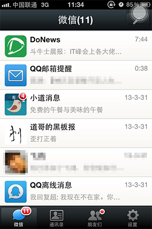(笔者的QQ里,最近联系人拖移到了第一项,感觉还不错) 微信将动态置于首个界面,并非简单的把最近联系人前置了,在实际使用中会发现,动态栏实际上变成了“Feed”流,而联系人变成了“Feed源”,相比起来,微信的结构介乎于IM与微博之间,他可以接收任何信息的推送,不论是即时信息还是公众信息。整个微信的结构主体变为三块:1、信息的聚合器 2、信息源的管理 3、信息交互方式(即聊天界面),这创造了并不单一的交流方式,而是一个人与外部沟通的窗口。 重塑沟通:多层级的信息结构。 在微信当前的信息源种类中,大致有几种:1)联系人 2)公众账号 3)应用程序 4)其他内容(漂流瓶、邮箱等)。 多种信息源都采用同一种方式进行推送,这在微信是一个问题,对于聊天信息来说,是重要性强,需要采用数字通知进行高压力推送的。但对于订阅内容,却需要保持低压力,让用户主动访问,即我们会习惯电脑任务栏下跳动的QQ人像提醒有新消息,但无法接受我们每一条新的微博都有个提醒在跳动。对此,微信还没有很好的解决手段,我曾经做过小范围的调查,许多人表示因为公众账号推送的信息与聊天信息混淆,并且都采用数字通知的方式,导致十分厌烦公众账号的信息。 当然,其实微信早就对此问题做了优化,对信息重要性进行了分级,仅在收到高级别信息的时候才使用安卓的任务栏与震动进行提醒,但实际效果并不佳,在此不细表。不仅存在推送的方式差异,多种信息源的融合也是一个问题,在其他的产品中,用户关系圈往往仅存在一种类型,譬如QQ的1对1关系,微博的1对多关系,群组的多对多关系,而微信通过信息的聚合器,试图将这些内容都聚合起来。
