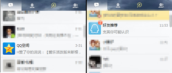(QQ客户端的 “最近联系人” 开始聚合第三方通知) 在2013版本的QQ里面,客户端研发部门已经做了初步的试探,“最近联系人”已经慢慢转变成了一项信息源的接收界面,不仅是联系,且将“好友相片”功能添加到了该界面,或许在未来几个版本中,腾讯会将“最近联系人”提到首界面。 该文章在 2013/4/3 12:32:22 编辑过 |