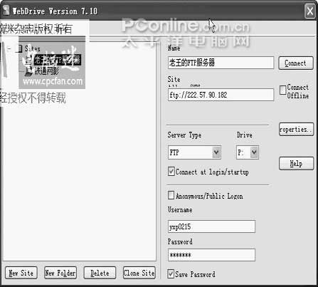 FTP站点是因特网上比较重要的资源,但是登录FTP网站和操作FTP站点上的文件或文件夹仍然比较繁琐。在资源管理器器可以把一个远程电脑上的文件夹映射成一个分区,那么能不能把一个远程FTP站点映射成本地资源管理器上的一个分区呢?答案是肯定的,WebDrive这款软件能轻松帮助大家实现这个愿望。 从本质上来说,WebDrive也是一款FTP客户端软件,和CuteFTP、FlashFXP等FTP客户端软件不同的是WebDrive能把远程FTP站点映射成本地磁盘。 翻译为中文为“网络磁盘”,这也就是说可以把远程站点映射成“我的电脑”中的一个分区,可以像在资源管理器中操作文件或文件夹那样,对远程FTP站点或者说远程FTP服务器上的文件或文件夹进行复制、移动、删除、重命名等操作(需要有相应的权限)。 WebDrive还支持对多个FTP站点进行映射,利用它的这些特性,还可以在多个远程FTP服务器之间互传文件。 WebDrive一路回车即可完成安装。安装后会在桌面上创建快捷方式,双击该快捷方式启动WebDrive,软件会缩小在系统托盘,如果此时在WebDrive中已添加了FTP站点,已映射的远程FTP站点就会以驱动器的形式显示在“我的电脑”中。那么如何在WebDrive中添加FTP站点呢? 提示:如果需要经常对FTP站点上的文件操作,可以在WebDrive的“Program Settings(程序设置)”对话框上选择相应的选项WebDrive随Windows一同启动。 双击系统托盘上的WebDrive图标打开WebDrive窗口,点击窗口左下方的“NewSite(添加站点)”按钮,在弹出的新建站点向导上依次输入站点的名称、站点的URL地址、用户名和密码,最后再为该站点指定一个盘符就可在WebDrive窗口上添加一个远程FTP站点。 在WebDrive窗口上,可以对已添加的FTP站点进行再编辑(如图1)。在窗口的左侧选择一个已添加的FTP站点,在右侧可以修改这个站点的名称;在“Drive(驱动器)”下拉菜单中,还可以重新为该站点指定一个盘符。 选择“Connect at login/startup(登录/启动后连接)”复选框,这样当WebDrive启动后就可以把该站点映射到“我的电脑”或资源管理器中。在用户名和密码部分,勾选“Save Password(保存密码)”可以使你在连接到FTP站点时不用再次输入密码,另外,如果该站点允许匿名登录,选择“Anonymous/Public Logon(匿名登录)”复选框可不必输入用户名和密码。 图1 对已添加的FTP站点进行再编辑 在远程FTP站点映射在资源管理器中(如图2),如果有读写权限,就可以像在本地操作文件或文件夹一样创建文件或新建文件夹,也可以使用拖动的方法把这个驱动器的文件或文件夹复制或移动到其它驱动器,当然,也可以把其它驱动器中的文件或文件夹拖动到这个驱动器,一切操作都像在本地进行一样。 图2 象在本地操作文件一样 该文章在 2013/4/29 1:37:42 编辑过 |