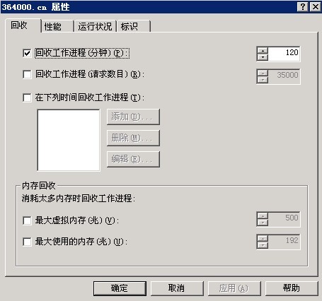 解决CPU占用过多: 1、在IIS中对每个网站进行单独的应用程序池配置。即互相之间不影响。 2、设置应用程序池的CPU监视,不超过25%(服务器为4CPU),每分钟刷新,超过限制时关闭。 根据w3wp取得是哪一个应用程序池: 1、在任务管理器中增加显示pid字段。就可以看到占用内存或者cpu最高的进程pid 2、在命令提示符下运行iisapp -a。注意,第一次运行,会提示没有js支持,点击确定。然后再次运行就可以了。这样就可以看到pid对应的应用程序池。(iisapp实际上是存放在C:\windows\system32目录下的一个VBS脚本,全名为iisapp.vbs,如果你和我一样,也禁止了Vbs默认关联程序,那么就需要手动到该目录,先择打开方式,然后选“Microsoft (r) Windows Based Script Host”来执行,就可以得到PID与应用程序池的对应关系。) 3、到iis中察看该应用程序池对应的网站,就ok了,做出上面的内存或CPU方面的限制,或检查程序有无死循环之类的问题。 解决内存占用过多,可以做以下配置: 1、在IIS中对每个网站进行单独的应用程序池配置。即互相之间不影响。 2、设置应用程序池的回收时间,默认为1720小时,可以根据情况修改。再设置当内存占用超过多少(如500M),就自动回收内存。 我的设置如下: 首先是对CPU的限制:在启用cpu监视后,我设置该应用程序池最大的cpu使用率为50%。设置刷新cpu时间为1分钟,设置操作为“关闭”。最大工作进程数设置为1。这个意思是,IIS刷新检测该独立池的CPU使用情况时间为1分钟,如果超过设置的cpu限制50%,就会发出关闭池的指令,要求池在指定的时间内关闭。如果池成功在这个时间内关闭,IIS会重启动一个新池,此段时间很短,一般不会有什么感觉,池就重新开启了,对于访问网站的人基本是不会有感觉的。但如果池没有在指定时间内关闭,IIS就会强行关闭它一个刷新CPU时间。在这个停止的时间内,网站无法访问,提示“Service Unavaliable”。 ![]() 关闭时间和启动时间间隔设置:设短一些比如10秒,这样当您的网站程序大量占用系统资源时IIS自动快速回收进程并且快速启动进程,您的网站暂时还可以将就着工作。 对内存的限制及进程回收时间的设置:我设置为内存占用超过800M就自动回收内存,虚拟内存没有做限制。进程回收时间我保持默认没有修改。各位可以根据自己的情况设置更短的时间。对应用程序池最大虚拟内存也可以在此进行设置,超过了设置的最大虚拟内存,该池会就被回收。 最后综合以前的一些经验,总结一些需要注意的问题: 该文章在 2014/3/26 0:25:40 编辑过 |