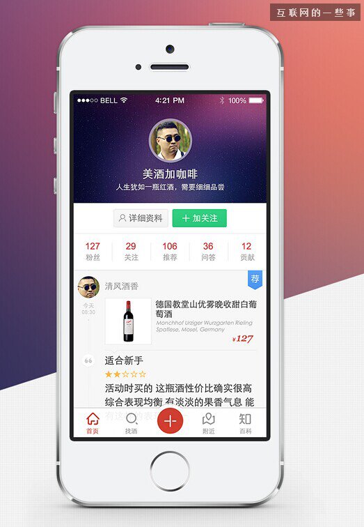 目前流行一种标签导航的变体,个人把它称为“舵式导航”,因为它的样式很像轮船上用来指挥的船舵,两侧是其他操作按钮。当页面有处于同一层级的几大部分内容,同时又需要一个非常重要且频繁操作的入口,就可以采用这种APP导航模式。如下图葡萄社APP。