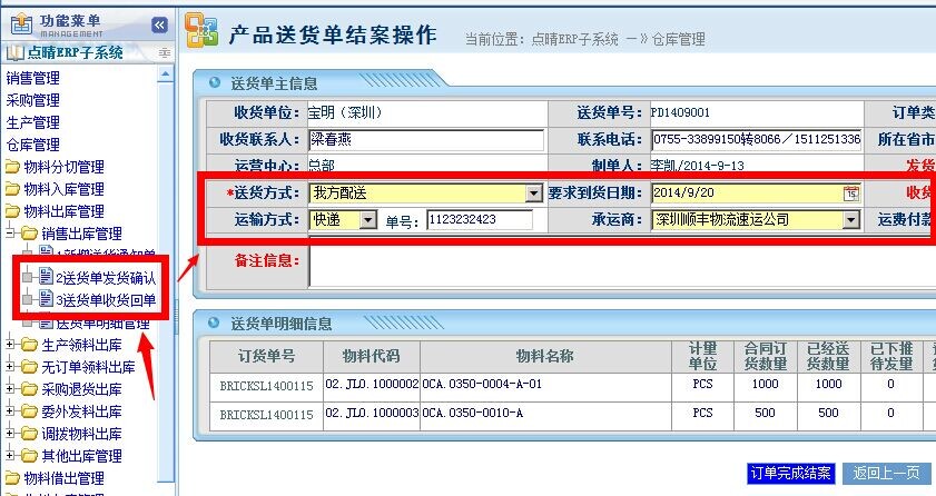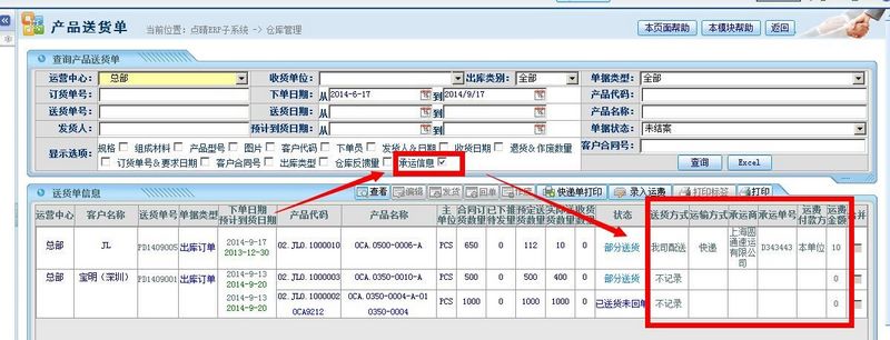 仓管岗位:在仓库管理-》物料出库管理-》销售出库管理-》送货单明细管理中,勾选“承运信息”: