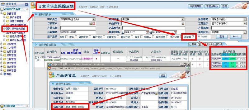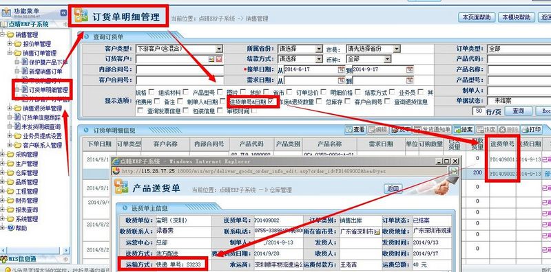 ![]() 销售岗位(业务员):或者在销售管理-》订货单信息跟踪中,勾选“送货单”,然后点击对应的送货单号,就会在弹出的送货单上看到快递单号了: