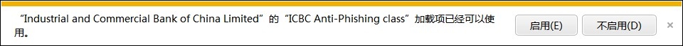 无奈以后每次启动IE9的时候,他都会弹出“ICBC Anti-Phishing class” 加载项是否要启用还是不启用的提示: